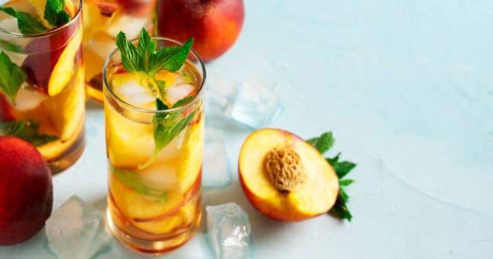 I like to add a few slices of fresh peaches and even a spring of fresh rosemary or basil leaves to finish off the look of this beautiful summer drink.