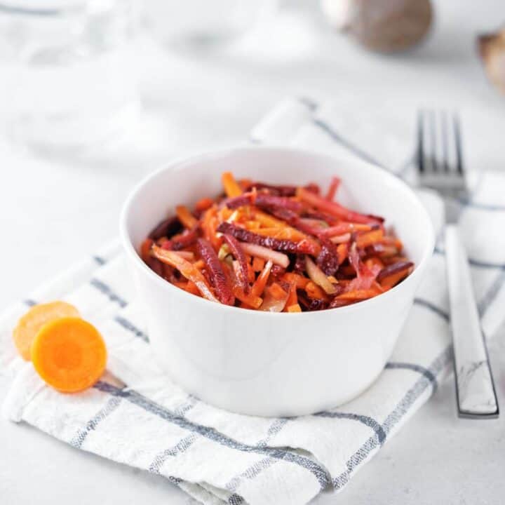 However, julienned strips are also another option. To julienne the carrots, you are essentially thinly slicing the carrots into matchstick strips. You can also try a julienne peeler if you have one of those.