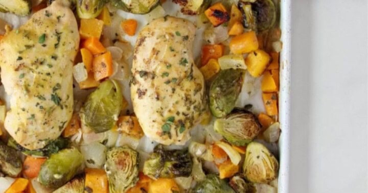 This sheet pan chicken in a mustard sauce is served with Brussels sprouts and butternut squash, and you have the perfect balanced dinner for you or your family. Cozy fall or winter paleo dinner option ready in under 30 minutes.